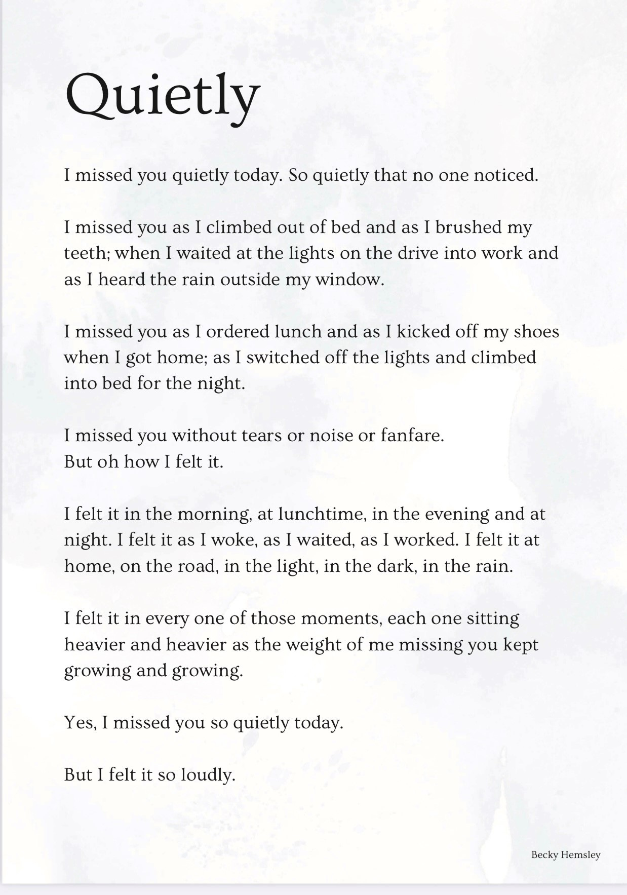 I came across this poem, Quietly, by Becky Hemsley, this week, which perfectly encapsulates how grief now feels to me.